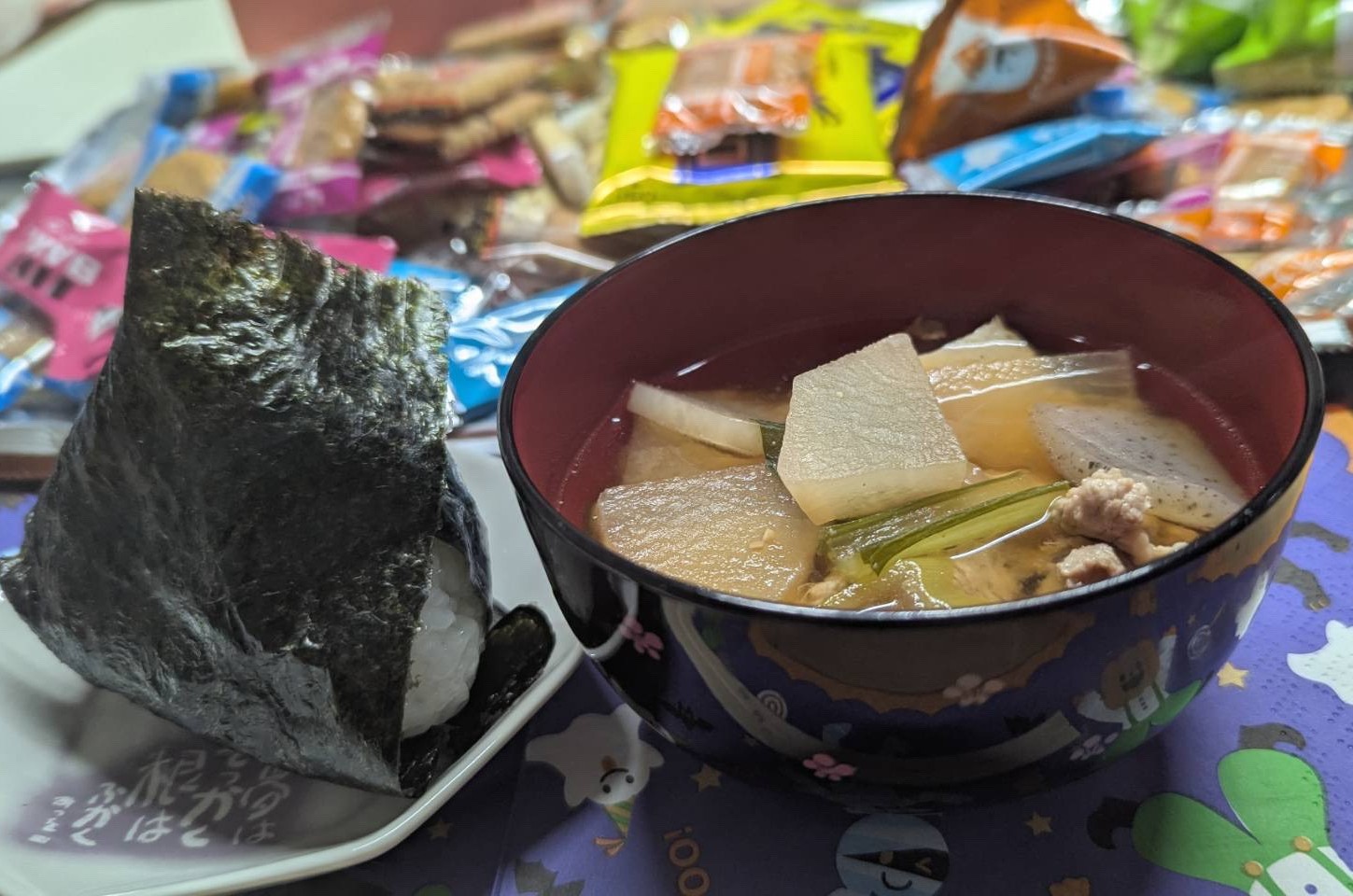 子どもも大人も自分でおにぎりを握り、豚汁を食べていました。
