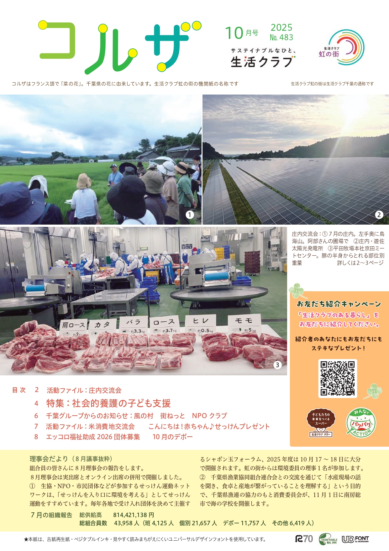 2019年10月号 | No.411 | 目次 2 活動ファイル 3 ひと:こども食堂から 4 特集:社会的養護の子ども支援 6 千葉グループからのお知らせ 7 JFSA・2019年度エッコロ福祉基金助成団体募集・第3期コルザモニター募集・赤ちゃんせっけんプレゼント 8 消費材:お米 10月のデポー |