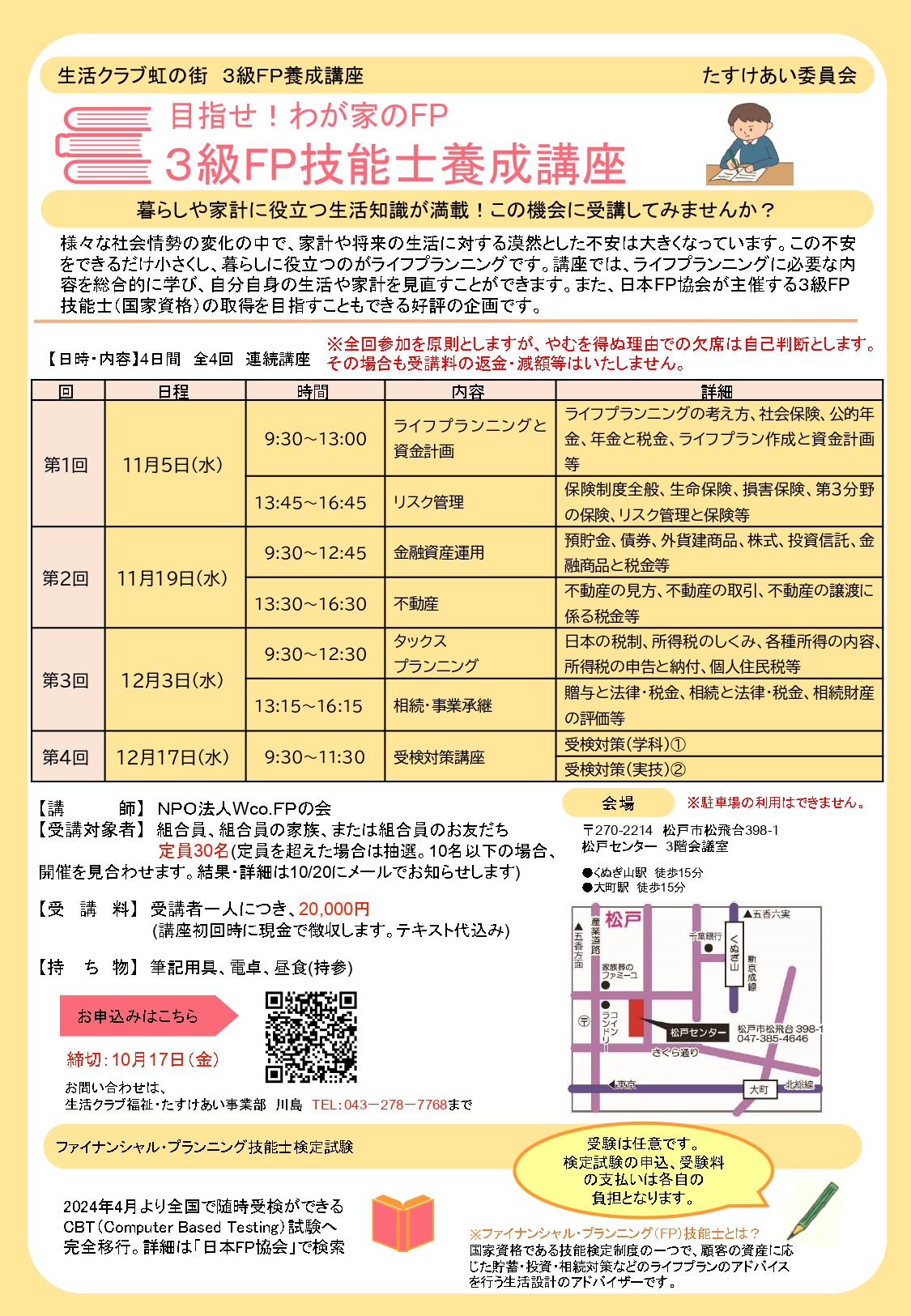 また、日本FP協会が主催する3級FP技能士(国家資格)の取得を目指すこともできる好評の企画です。