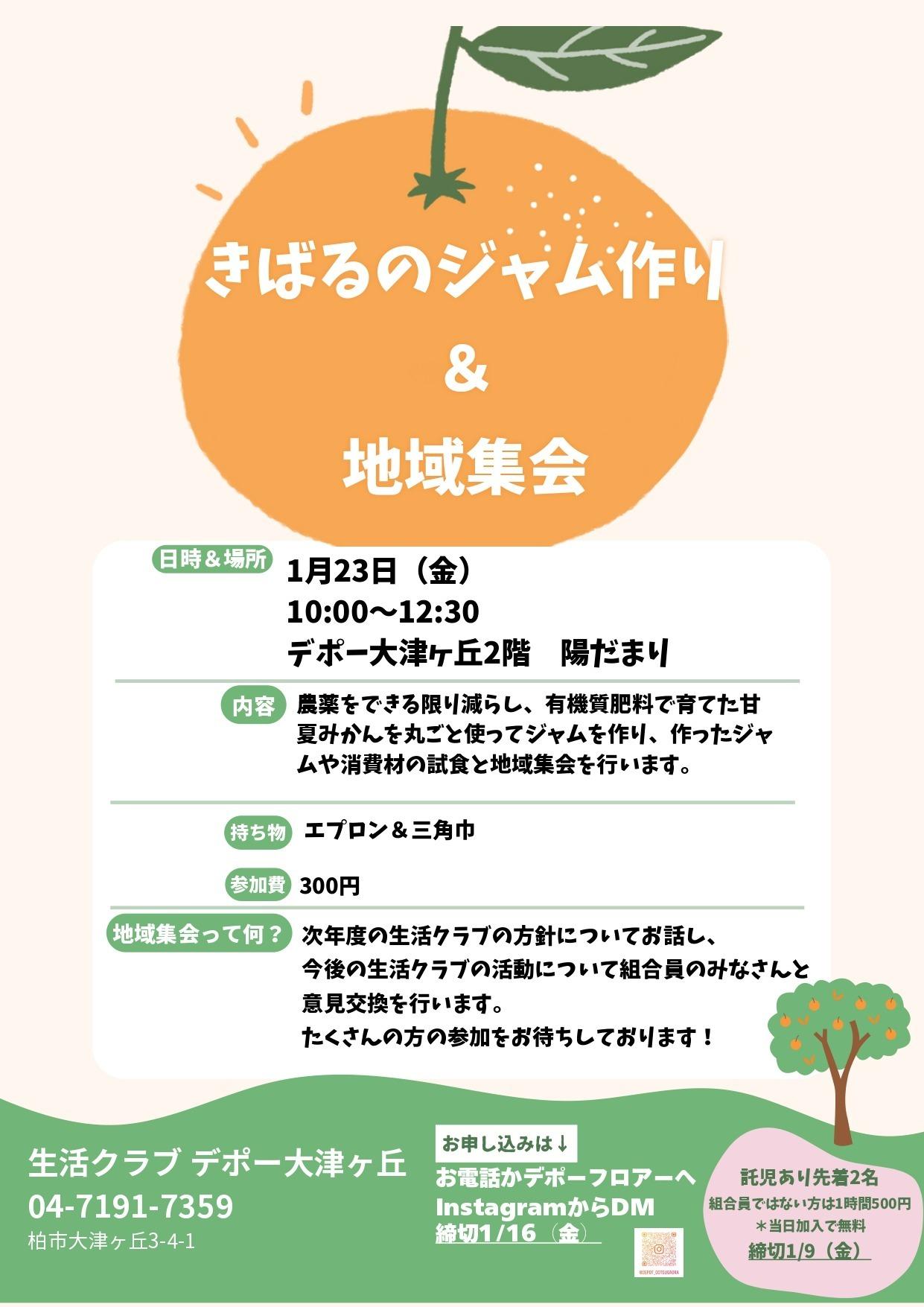きばるのジャム作り&地域集会 開催日:2026年01月23日 Tweet お申込みは、デポー大津ヶ丘(☎04-7191-7359) または、Instagram(@depot_ootsugaoka)のDMよりお願いします。