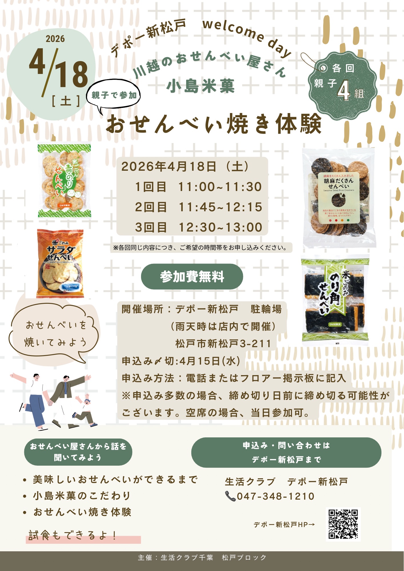 おせんべい焼き体験、ガラポン抽選、試食をお楽しみください。