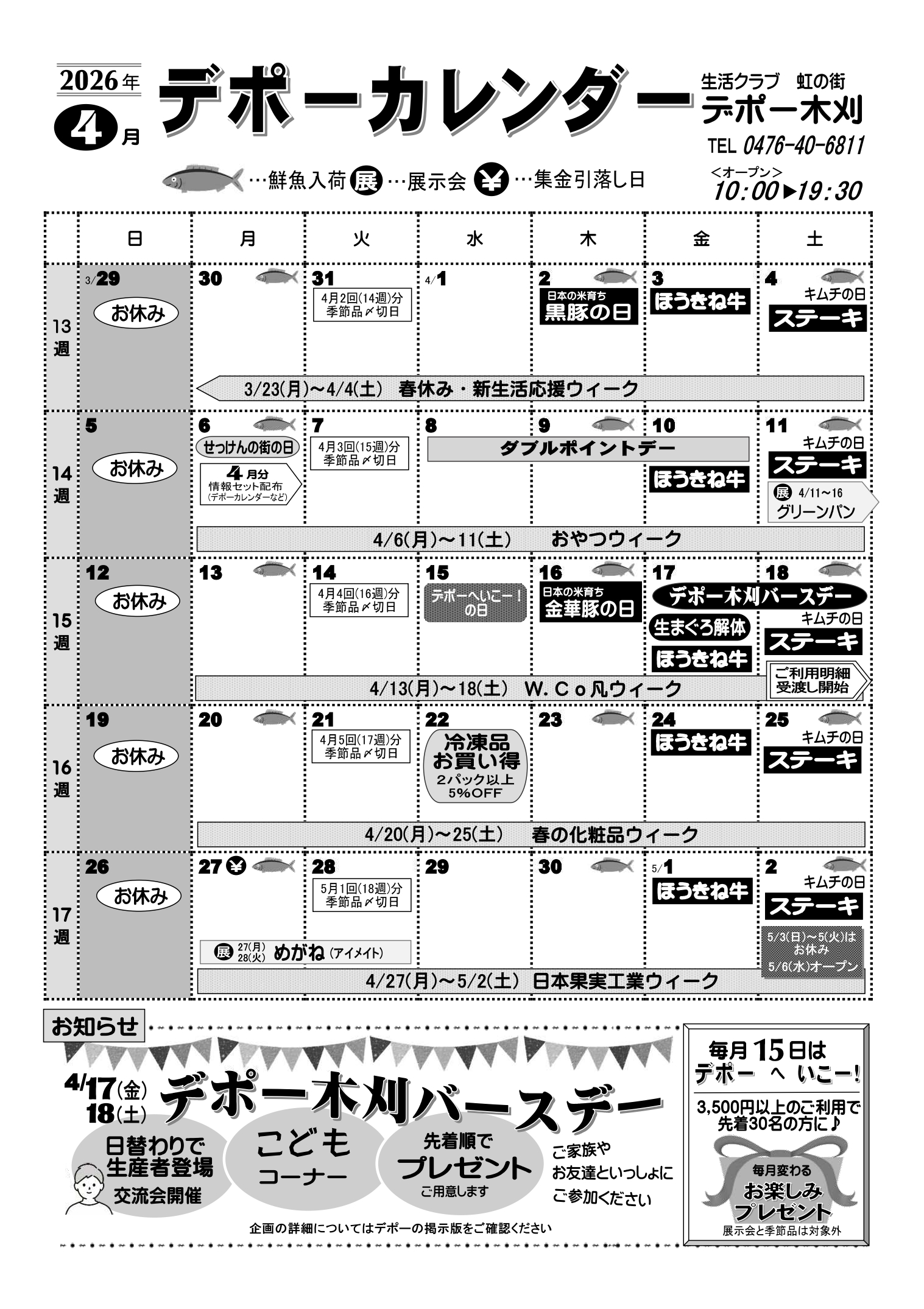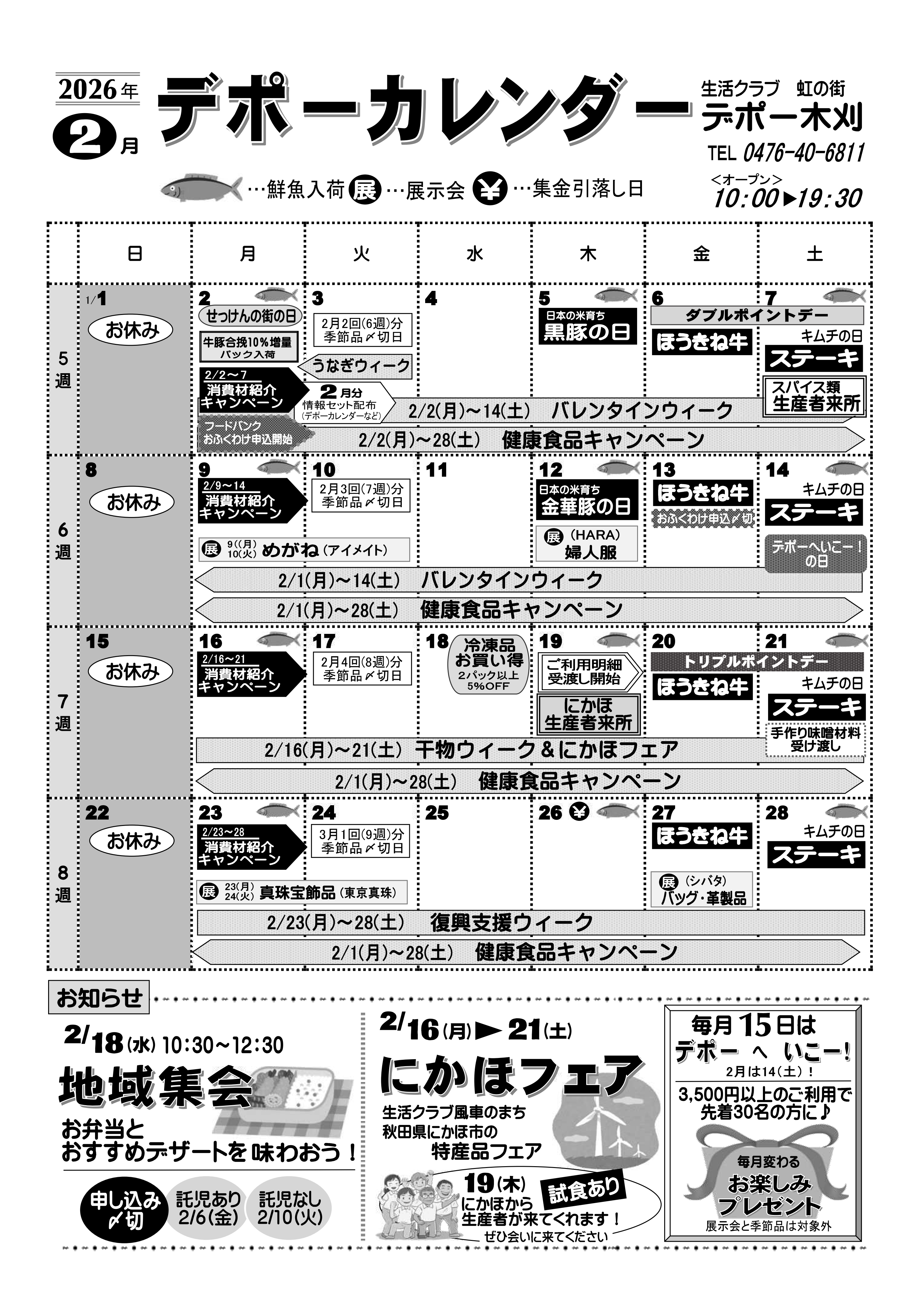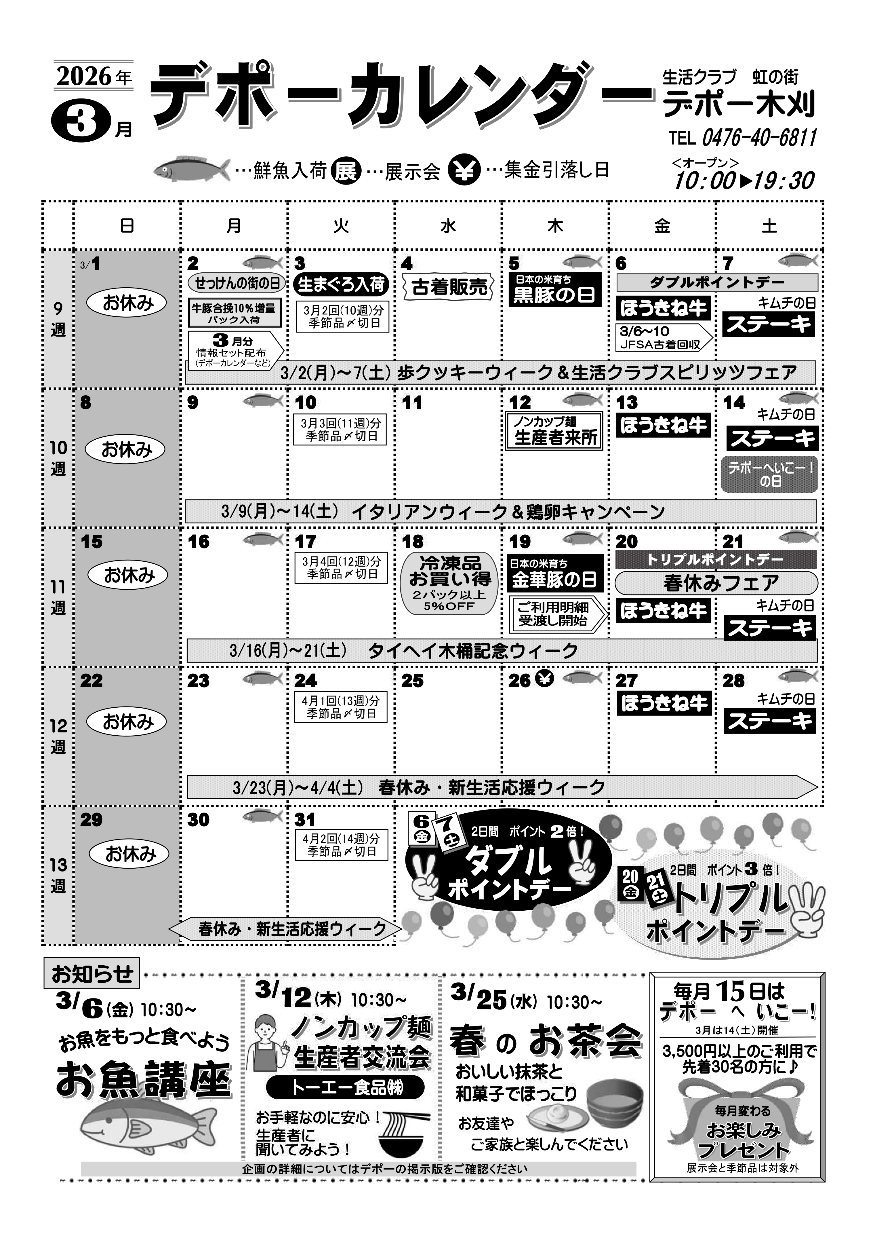 | 受付方法 | ●TEL・FAXでご注文 お天気の悪い日、体調のすぐれないときなどお出かけしなくても大丈夫!食品から雑貨まで当日デポーにあるものならなんでもOKです。