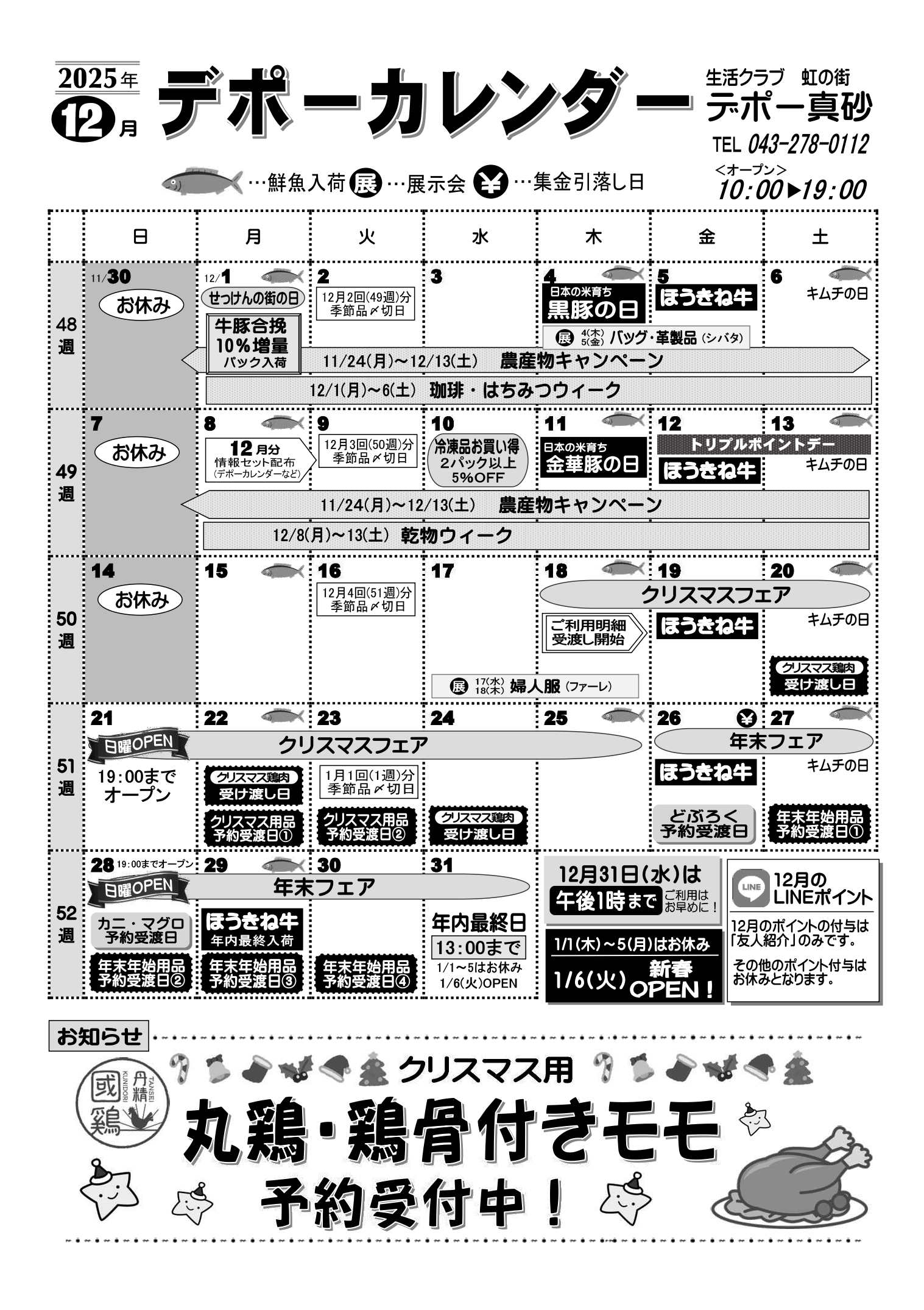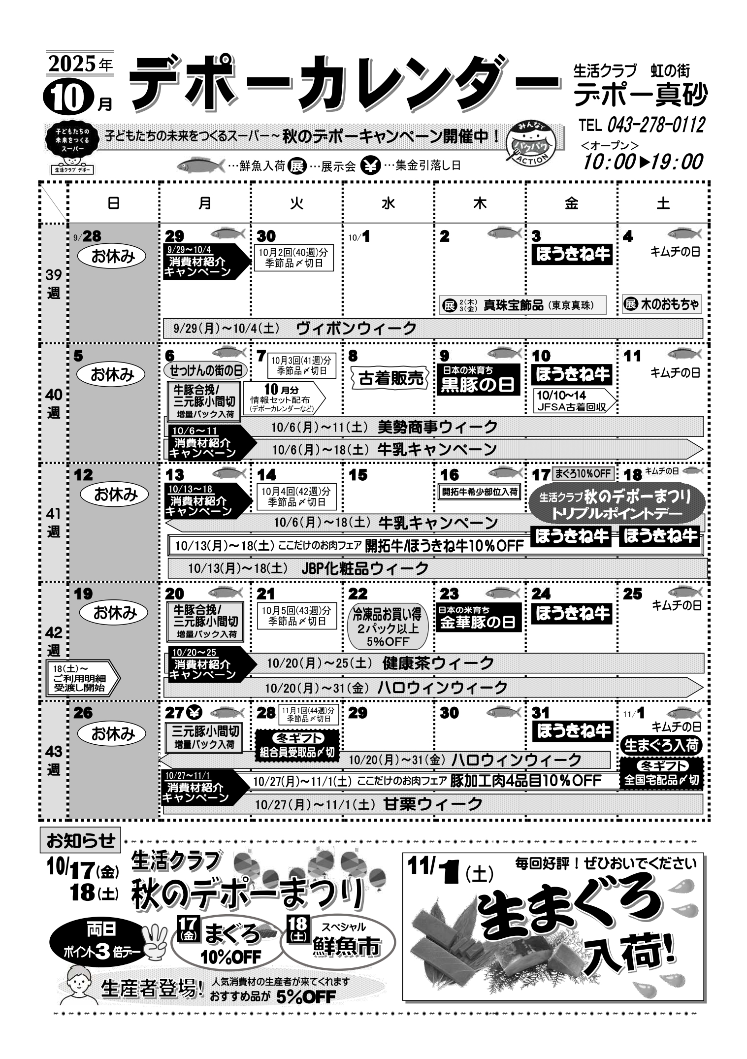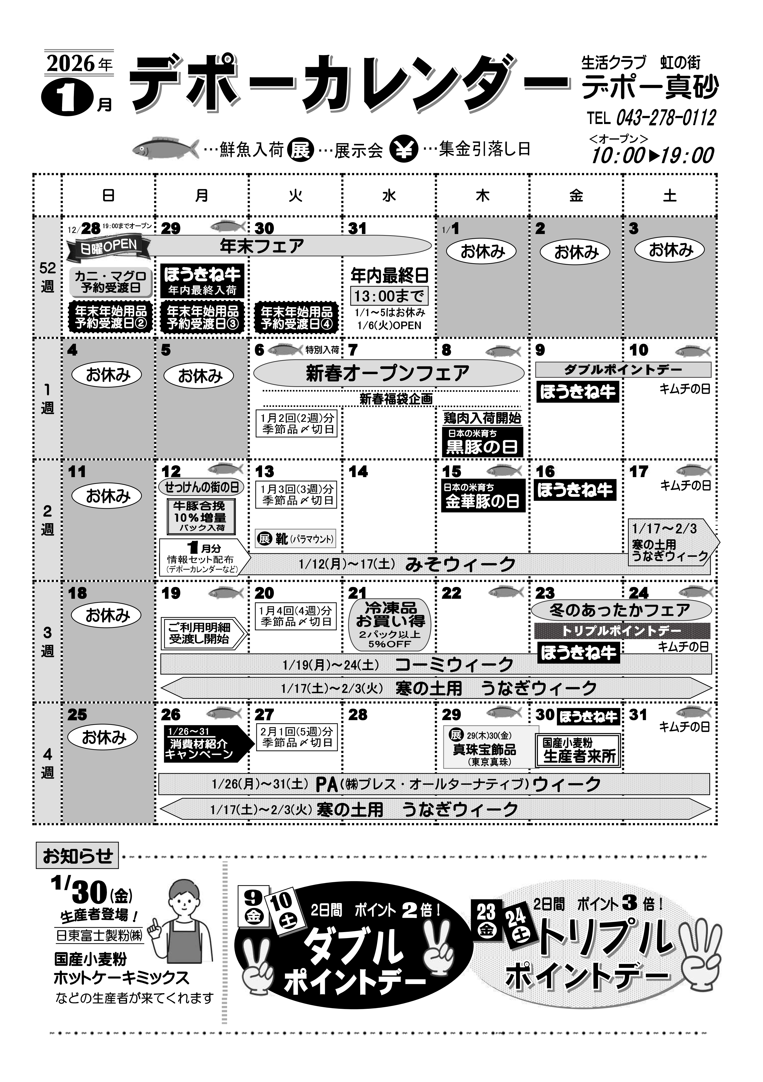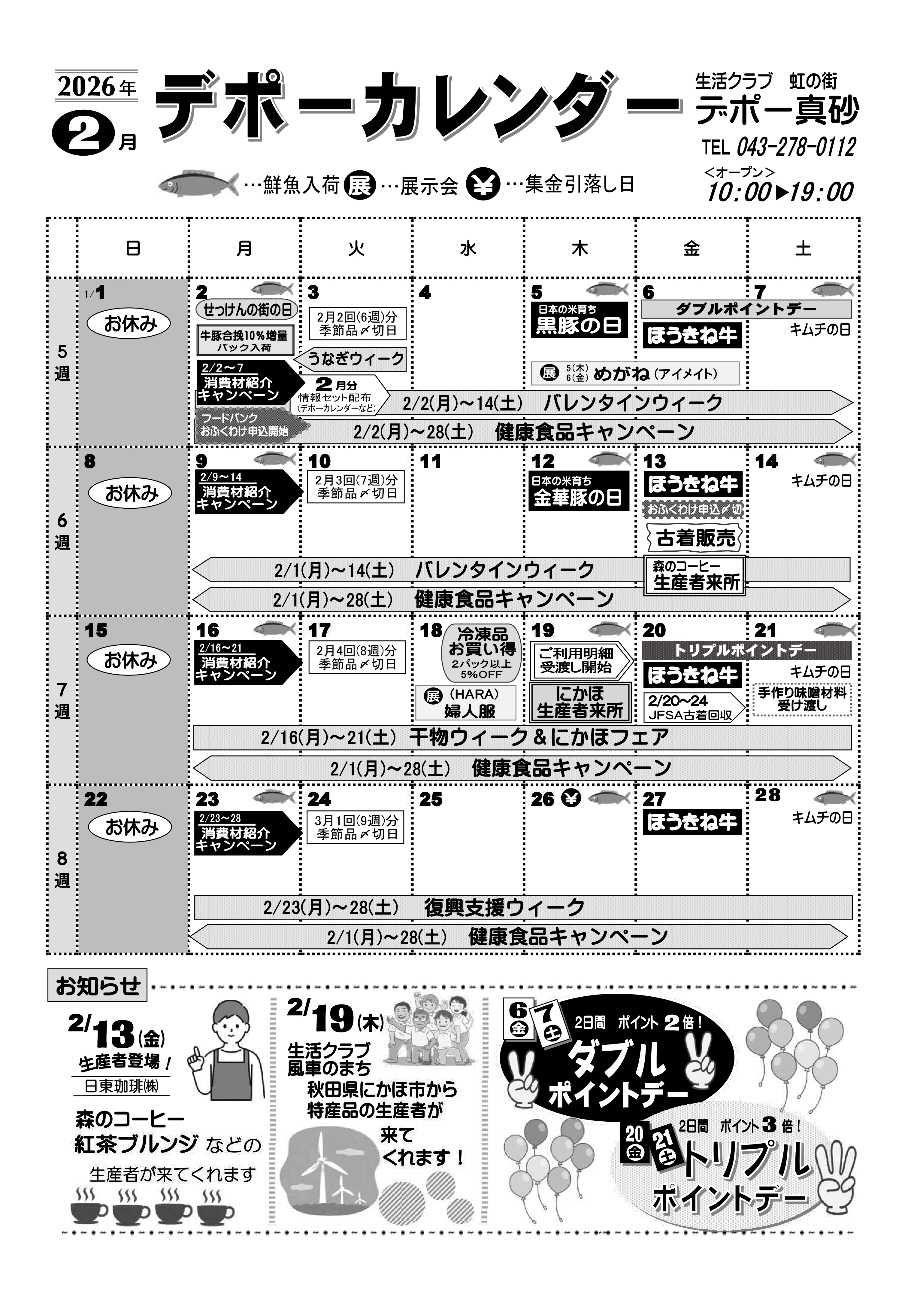 | 受付方法 | ●TEL・FAXでご注文 お天気の悪い日、体調のすぐれないときなどお出かけしなくても大丈夫!食品から雑貨まで当日デポーにあるものならなんでもOKです。